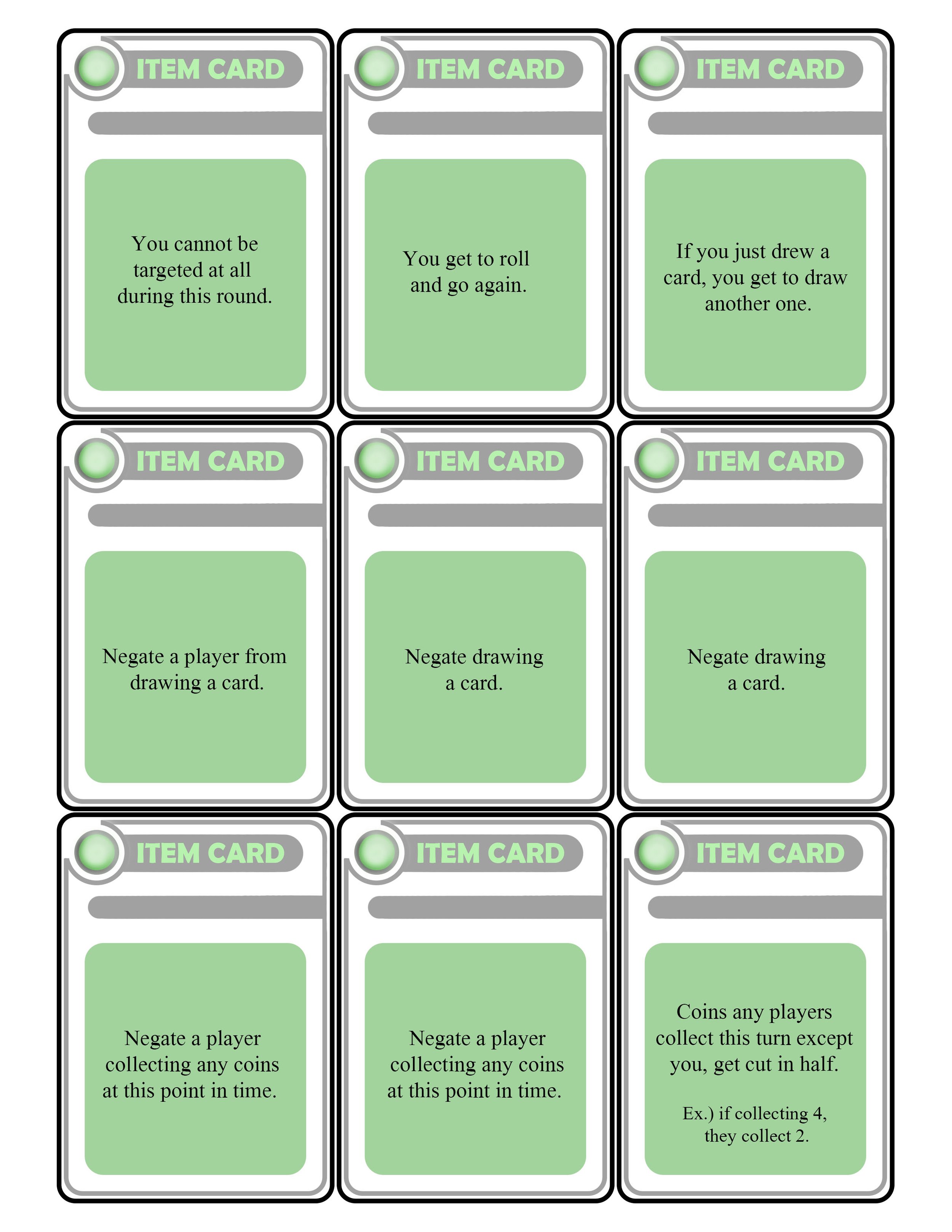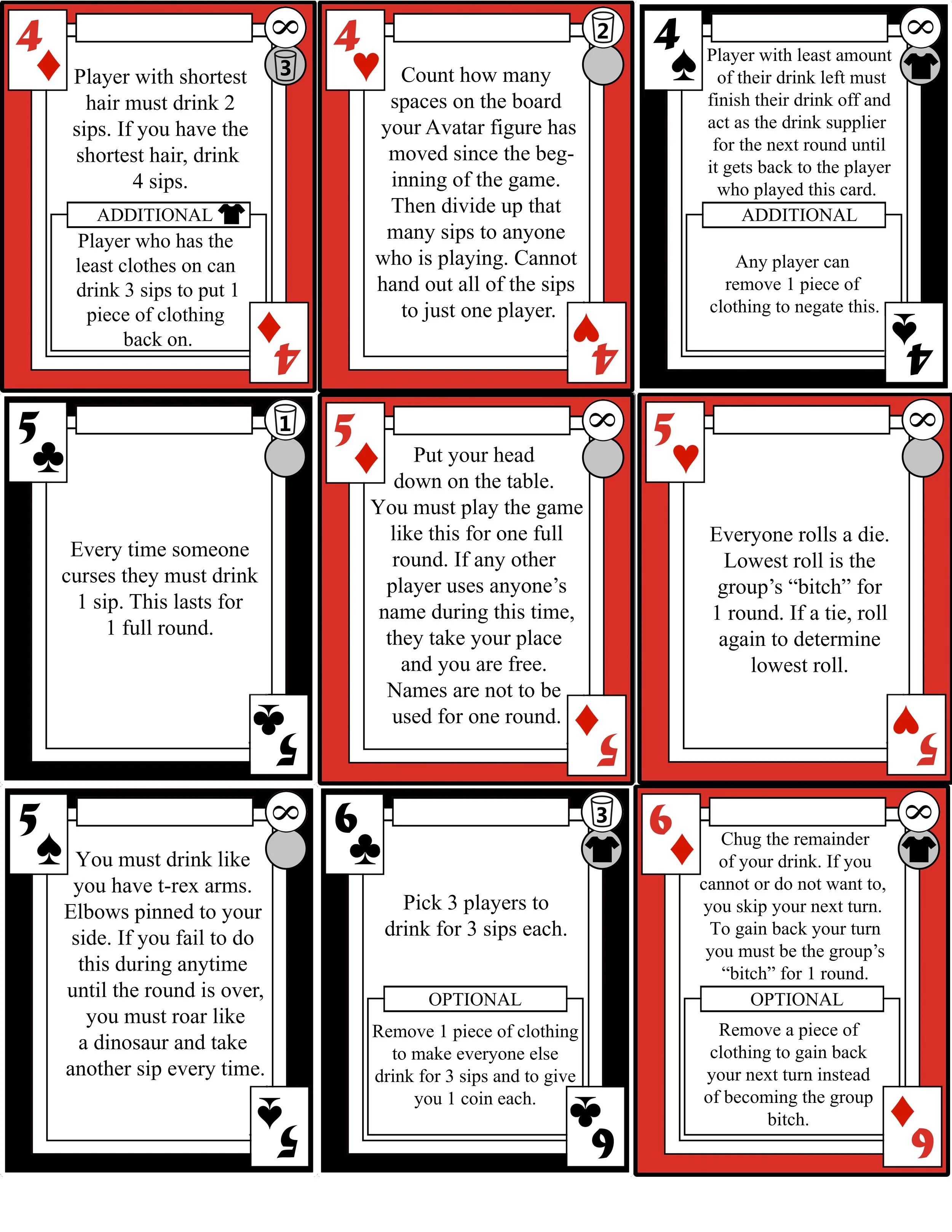 Print all of the black and red cards out and place them in one deck. These are the main cards players will draw from when landing on the “Pink” card symbol space on the board. Have fun writing in your own “Card Titles” on each card.