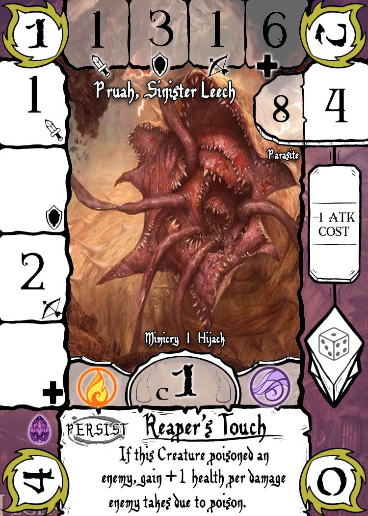 For example, the Amethyst Relic cards are geared towards poisoning enemy Creatures, so most Incantations would revolve around poisoning, or gaining life back from poisoned Creatures and the Status Attachments would also include perks such as Infect and Lifelink.