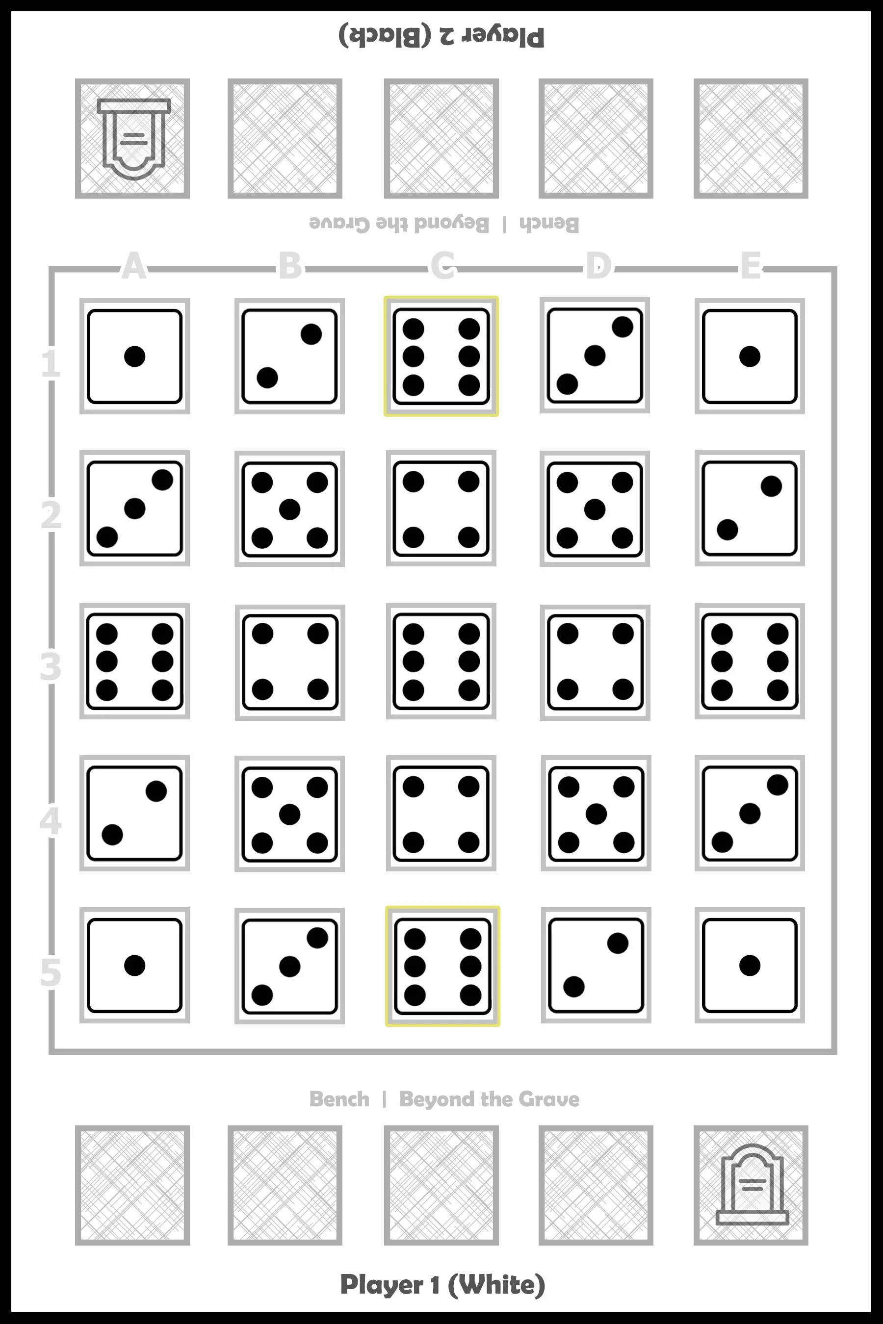 In this abstract conquest game, players strategize with directional movement cards that carefully dictate their chosen dice in hopes to outmaneuver and destroy their opponent's dice on the field. With each player's Command Cards face up, the battle becomes an intense tug of war of wits and future-sight where masterful planning and adaptability are your greatest assets.