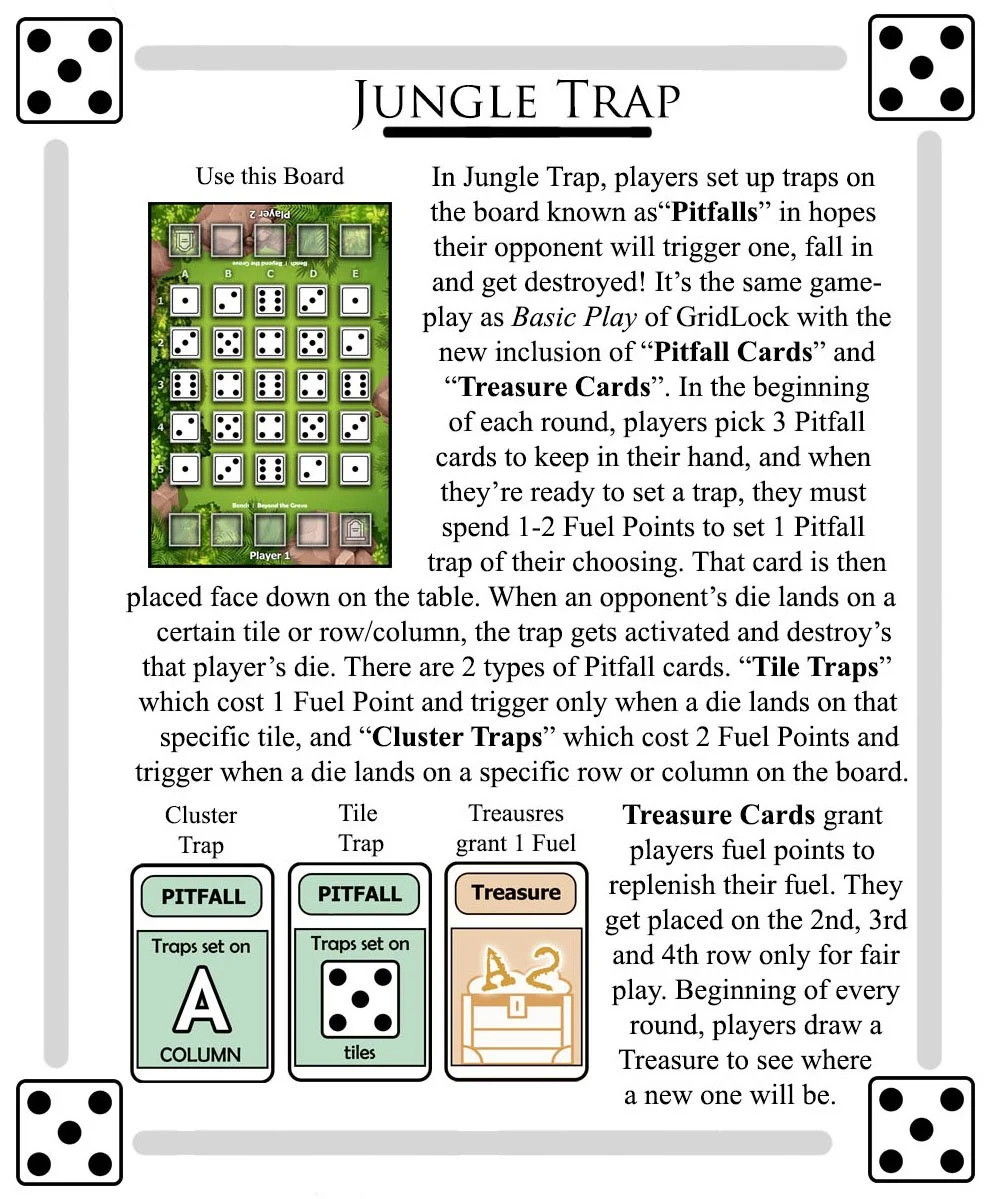 Gridlock is a simplistic yet challenging game of conquering dice on a 5x5 grid using Command Cards and 2 sets of 5 D6 dice.