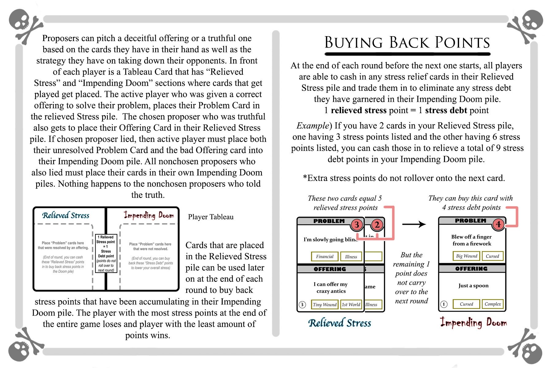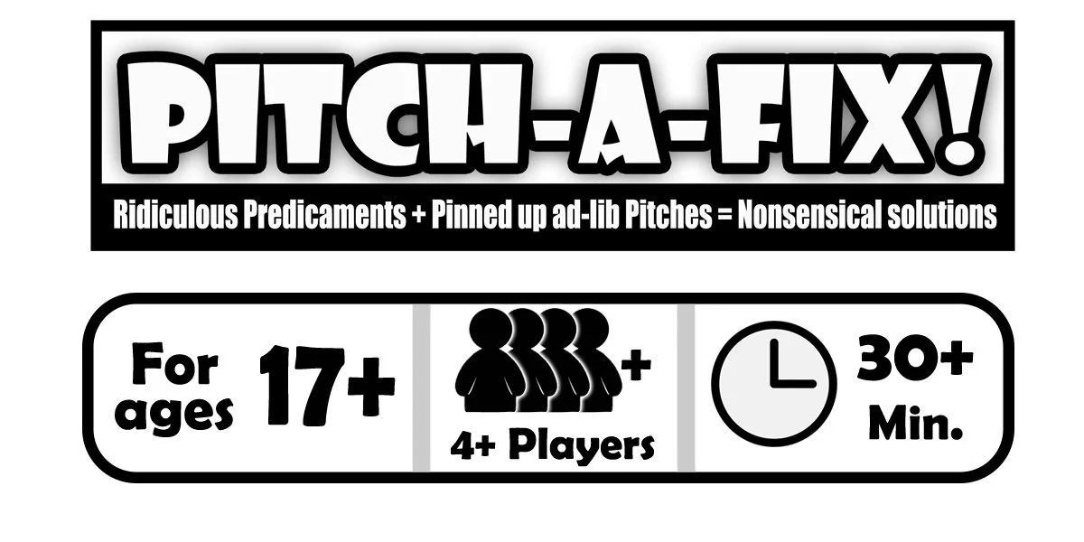 In Pitch-A-Fix! players must sales-pitch outlandish sounding offerings to other players who are in dire need of problem solving. The challenge for the player's facing the problem is that most offerings will sound completely ludicrous being the thing that can match and solve their particular problem, however it's up to the proposer to convince them otherwise. If the player's problem is not solved, they will gain the inevitable stress points that come with it, and at the end of the game, whoever has garnered the most stress points loses and the player who has the least amount of stress points wins.