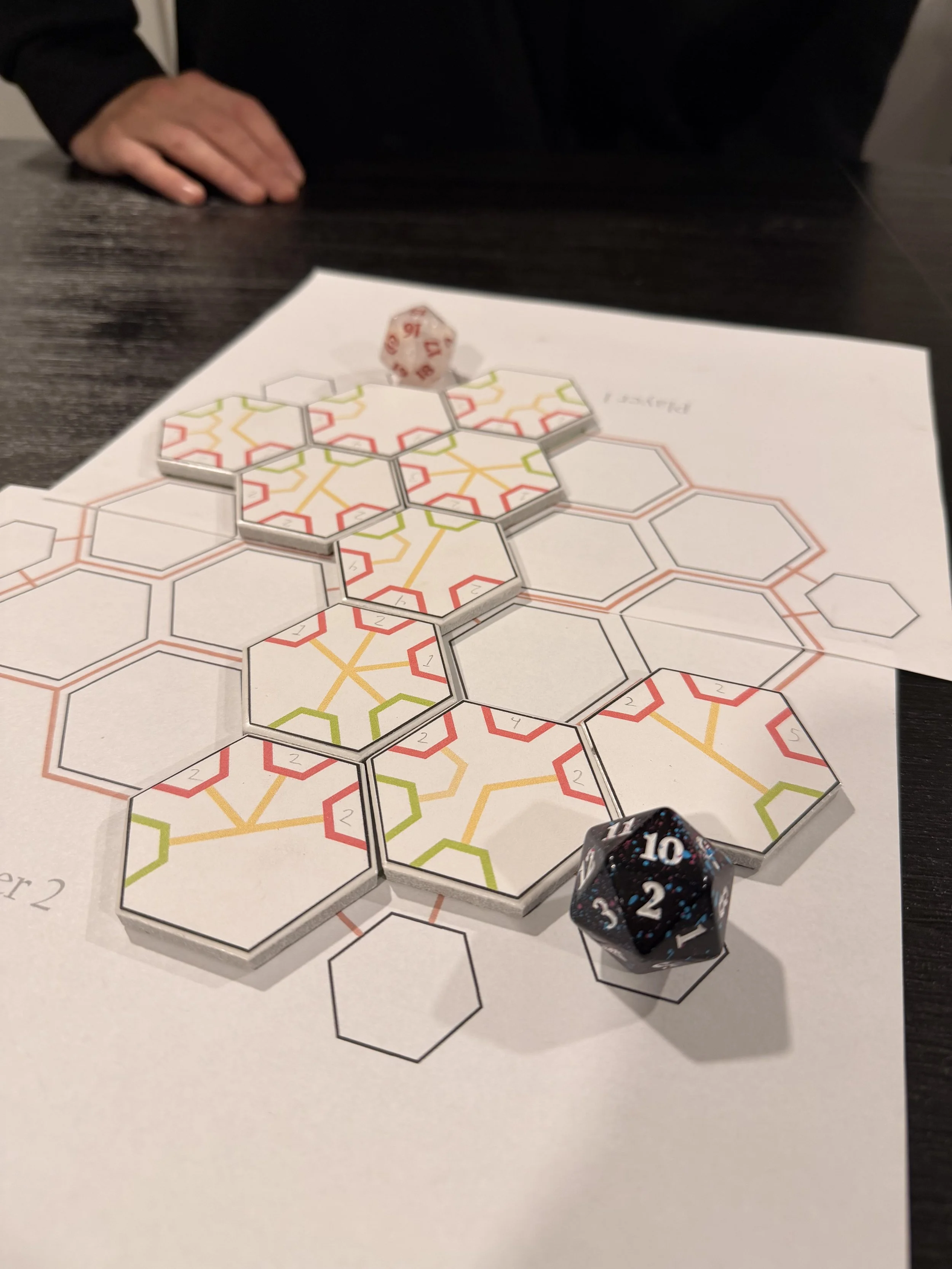 Tower Cell (Hex-Chess) is a 1v1 abstract board game where players draft and place hexagonal shaped tiles on the board to battle each other within a point based system. Each “Hex Tile” has green and red “cells” with numbers listed in them. Red Cells output damage during combat. Green Cells are boosters that can increase a Red Cells attack damage output as long as they’re linked (connected). To ensure victory over your opponent a player must know how and when to connect their hex tiles in a combination to obtain the most damage output to take over the board. To win, a player needs to destroy both of their opponent’s Tower Cells which have their own health points.