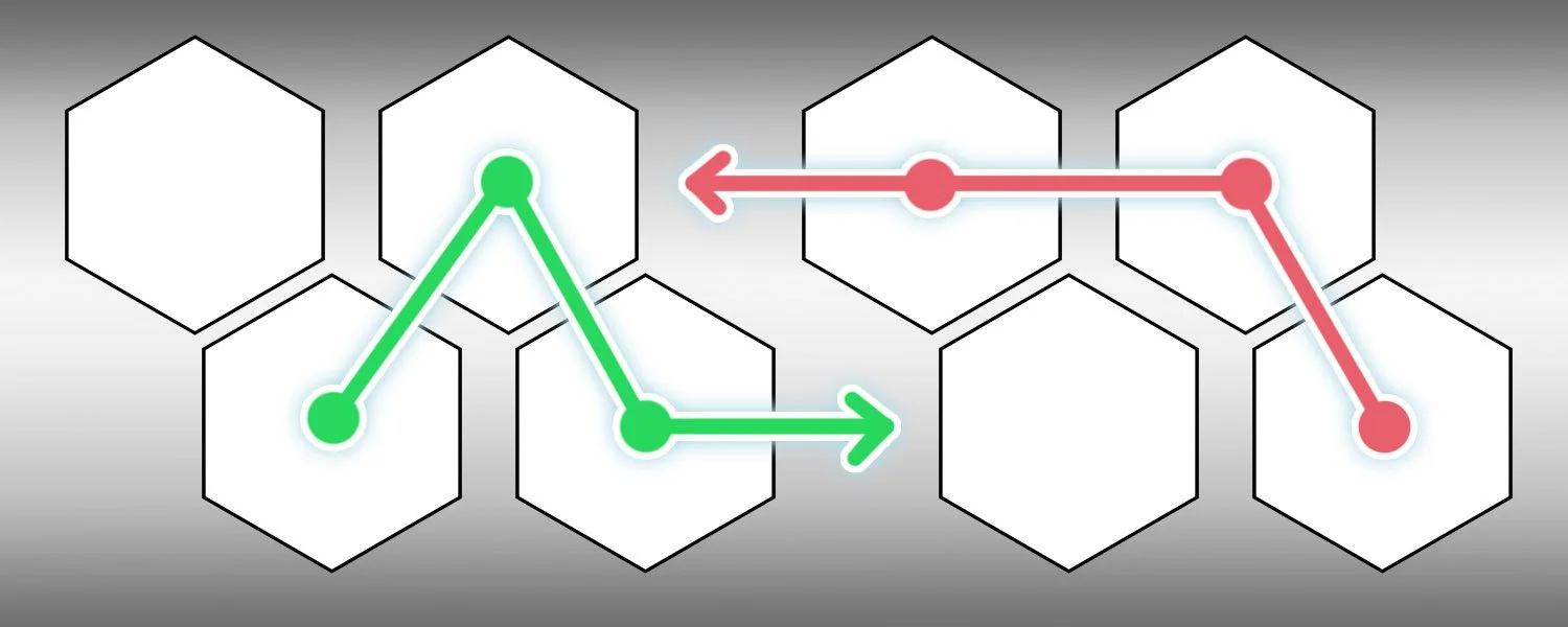 As long as a Hex-Tile’s Power Cells (green) are connecting another Hex-Tile’s Attack Cells (red) they are considered linked.