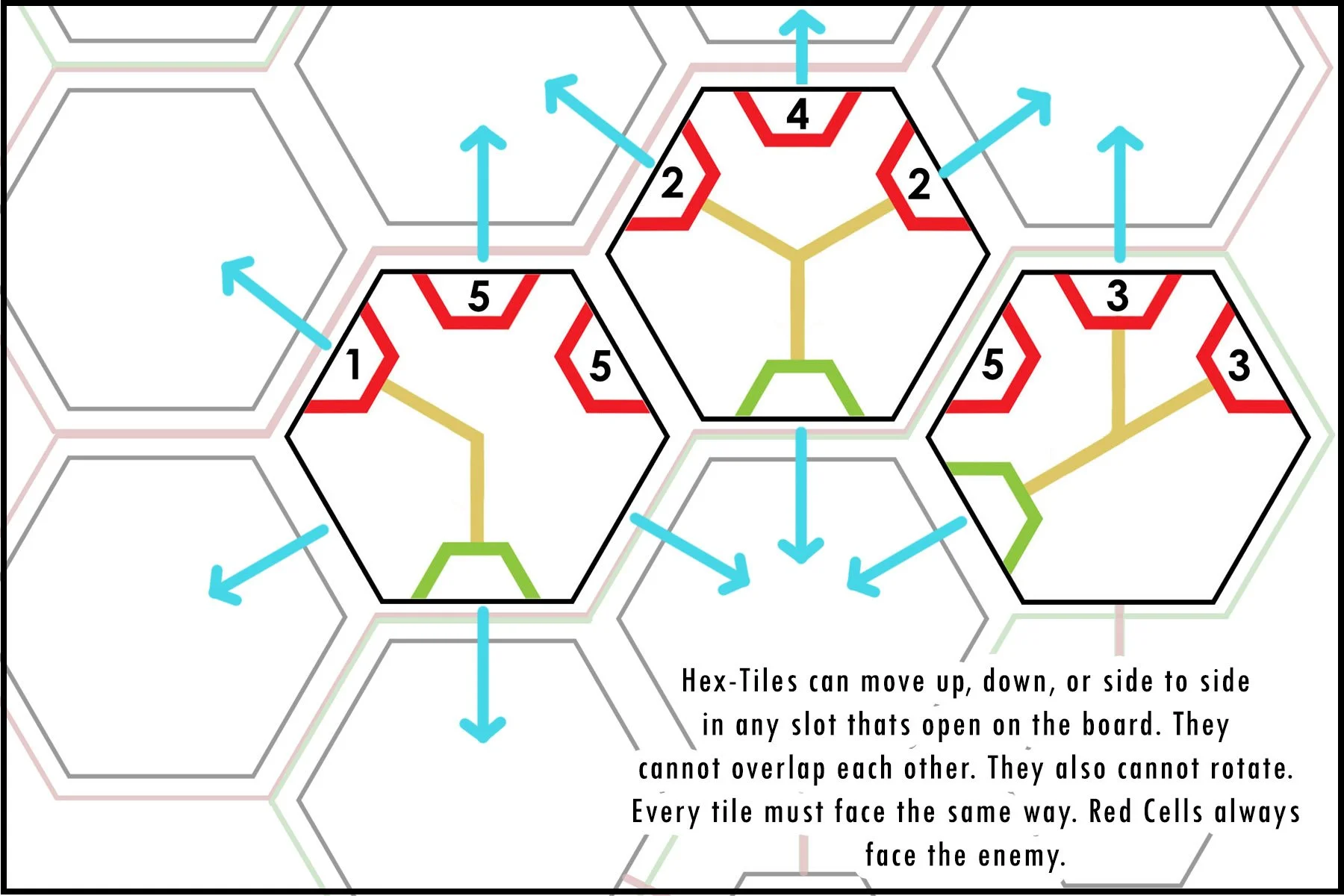 Hex-Tiles can move up, down and side to side on the board with the action called “Shift”. They cannot rotate. They must always face the same direction. Your Hex-Tile’s attack cells will always face your opponent. They also cannot overlap each other or stack or jump each other.