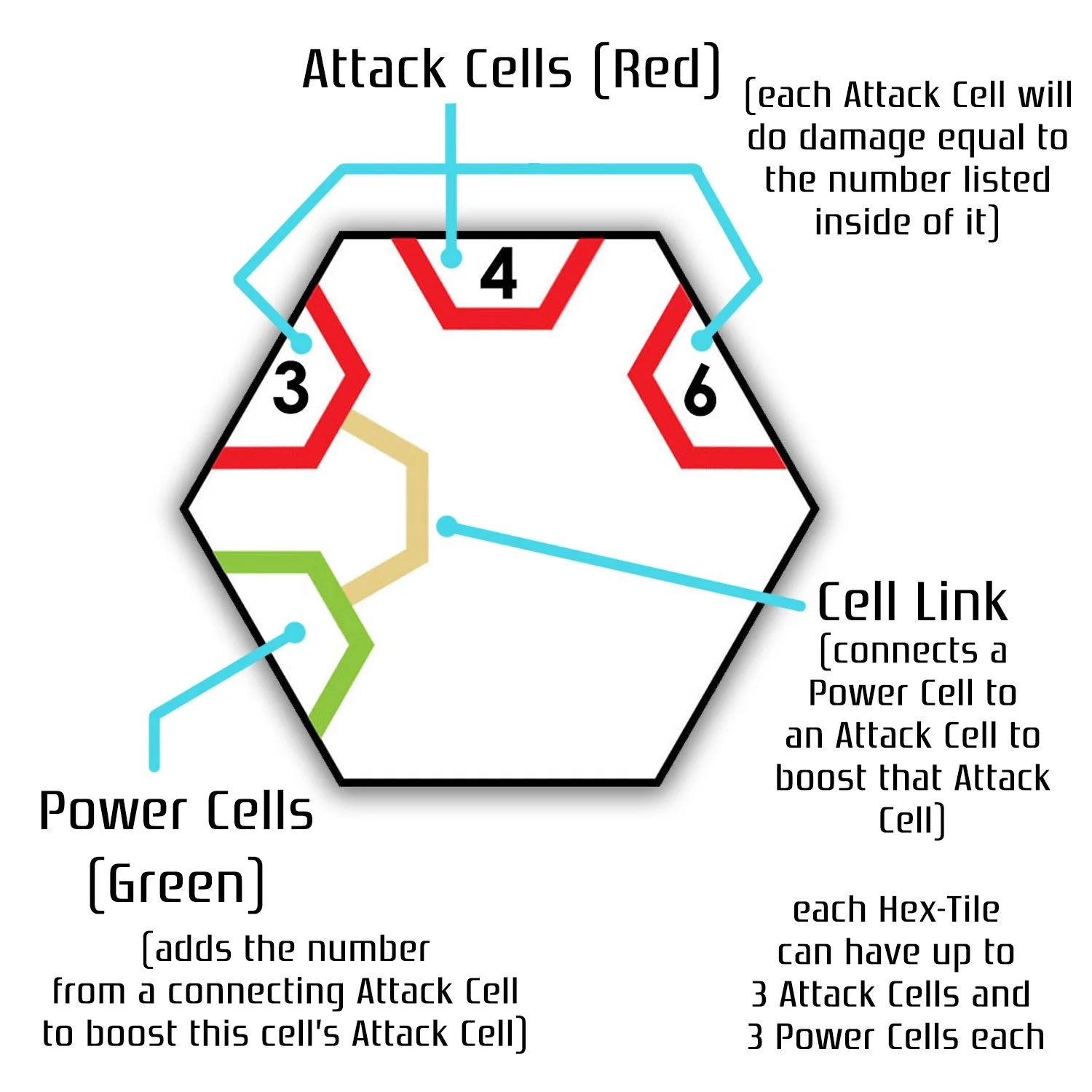 If a Hex-Tile’s Attack Cell is destroyed and there’s roll over damage, the player receiving the damage can choose to have that left over damage destroy any other Attack Cell that may be connected via Cell Link on that same Hex-Tile before they allow the damage to flow into another new connected Hex-Tile.